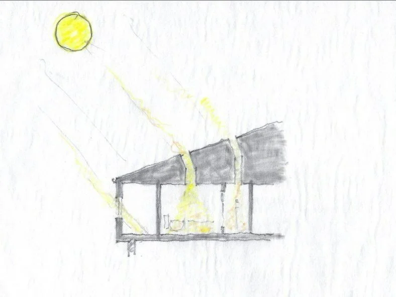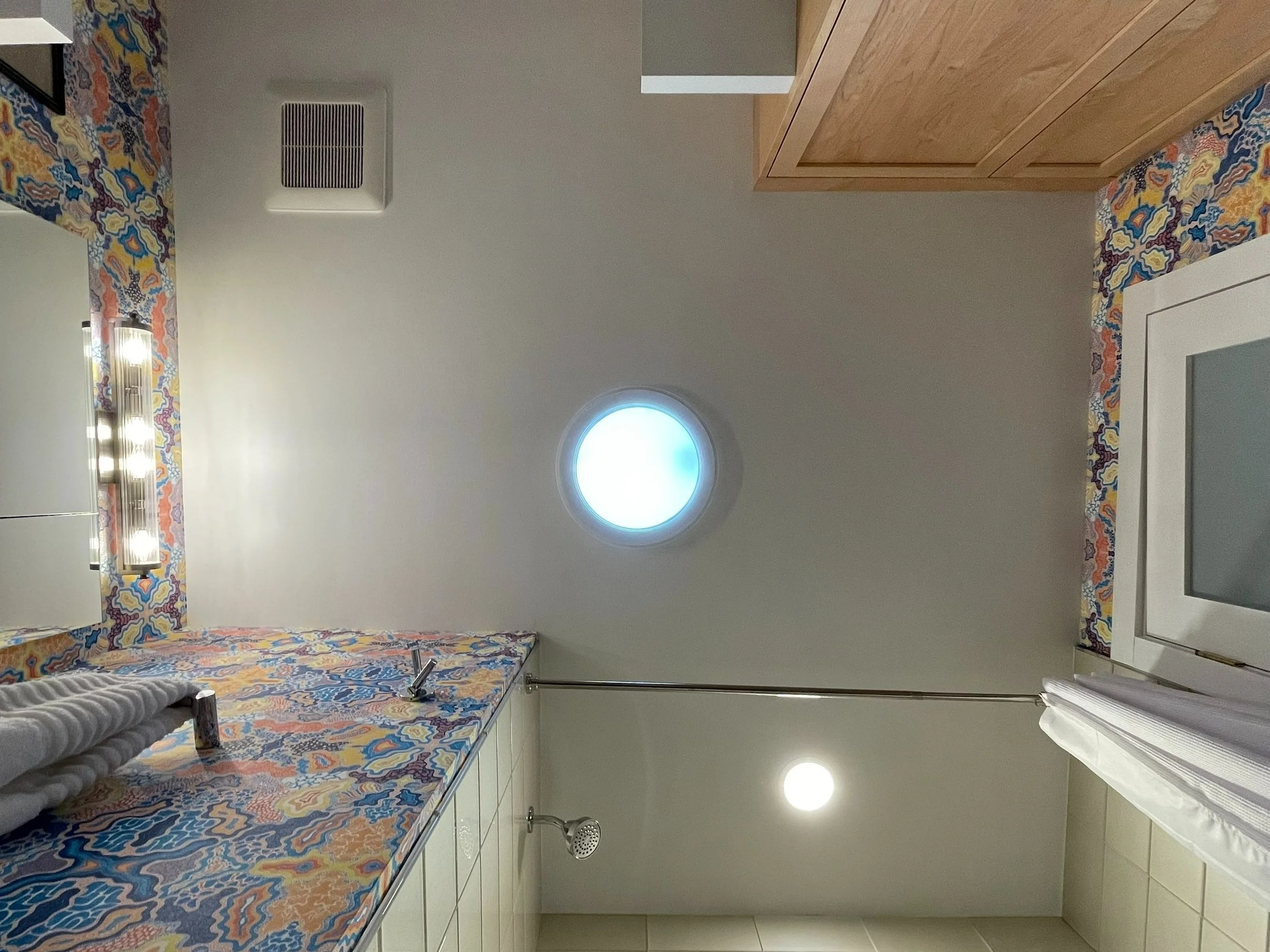 A window-less guest bath becomes a haven for natural lite through the use of solar tubes. The tubes act as light-wells, penetrating the attic above, allowing natural light to passively enter. An adjacent hall benefits from solar tubes, along with diffuse natural lite through a frosted glass door. Custom built-in linen storage, finished to match a new vanity, replaces a former closet. A mesmerizing wallpaper is simultaneously vibrant and calming.